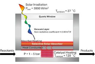 In this system, a quartz window at the top allows light to illuminate the solar absorber; a vacuum layer helps minimize heat losses; and the solar absorber sits at the bottom, in direct contact with the chemical reactor. The selective solar absorber achieves a calculated maximum temperature of 249 degrees C under one sun illumination and 130 degrees C under ambient operating conditions (25 degrees C, 1 atm). -Source via CALTECH.EDU